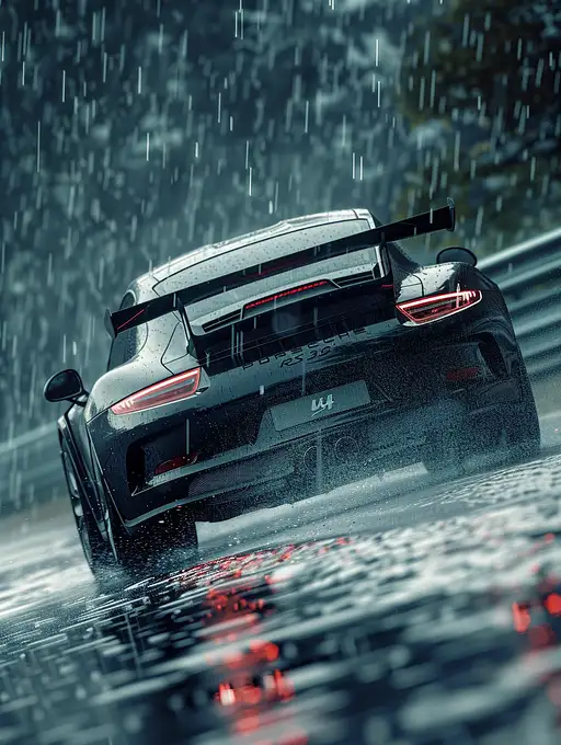 over 1 year ago a porsche rs gt3, running, rain, realist, u4, Nikon D6, AF-S NIKKOR 70-200mm f/2.8E FL ED VR, dark light, sports, motorsport, --ar 3:4 kalonev 6 280