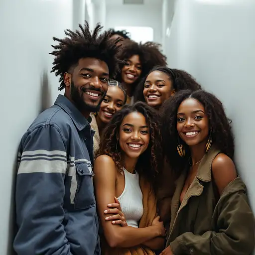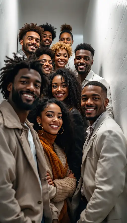 10 months ago Photo of a ultra realistic 8 African American friends in a tight stairway, men and women, facing the camera, smiling, in the style of hyper-realistic National Geographic photography, expressive, hyperrealism, photorealistic, detailed hair, hyper detail, cinematic lighting --ar 1:2 --stylize 750 kaystudio 1 37