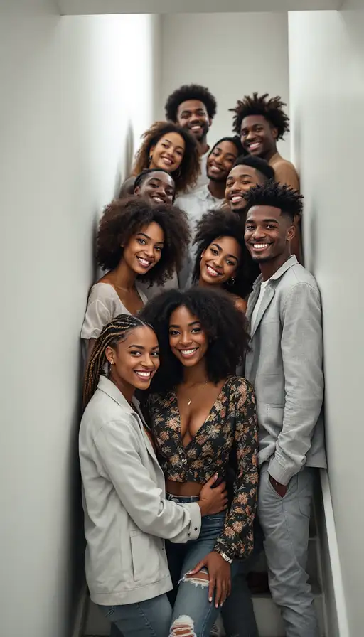 10 months ago Photo of a ultra realistic 8 African American friends in a tight stairway, men and women, one white woman, facing the camera, smiling, in the style of hyper-realistic National Geographic photography, expressive, hyperrealism, photorealistic, detailed hair, hyper detail, cinematic lighting --ar 1:2 --stylize 750 kaystudio 1 40