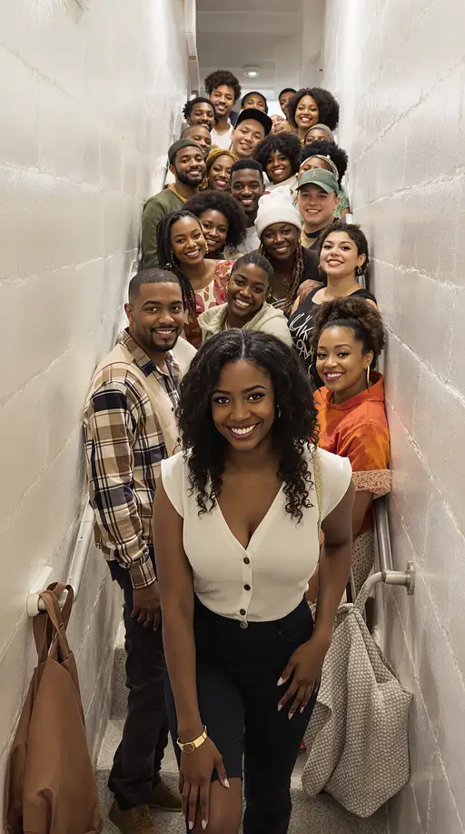 10 months ago Photo of a ultra realistic 8 African American friends one white woman, in a tight stairway, men and women, facing the camera, smiling, in the style of hyper-realistic National Geographic photography, expressive, hyperrealism, photorealistic, detailed hair, hyper detail, cinematic lighting --ar 1:2 --stylize 750 kaystudio 2 69