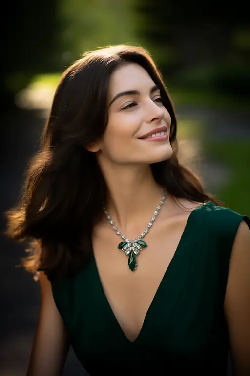 over 2 years ago Editorial style photo for luxurious necklace, featuring an oval - shaped emerald at its center with feathered silvers and small pearls alternating along the necklace, medium closeup shot, off - center, displayed on a young, brunette woman neck, eyes closed, smiling with her teeth, standing on top of a hill, wearing a black dress, natural lighting, using a Canon EOS 5D Mark IV DSLR camera with a 50mm f/ 1. 8 lens, realistic skin texture, Hyper - realistic, Ultra detailed, high - resolution 16k --ar 2:3 kechapasiin 1 150