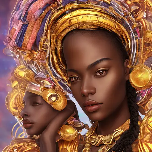 over 2 years ago fking_scifi, fking_scifi_v2, portrait of a young very beautiful African woman, in front of a beach, rich colorful clothes, turban and golden african jewelry, close up, regal pose and attitude. fking_cinema_v2. fking_cinema_v2 krybuch 0 41