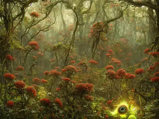 3 years ago a fisheye lens photo of forest full of living monster flowers and plants with eyes , powerful, cinematic, beautifully lit, by donato giancola, by artgerm, by karol bak, 3 d, perfect face and body, trending on artstation, octane render, 8 k lightsome 0 110