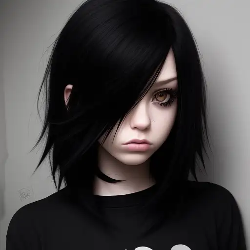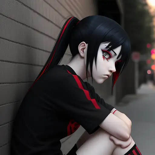 over 1 year ago side view anime emo girl. red eye iris. black shirt with red raceng stripes on the shirt. sitting in the street back against a wall. manyolorian 0 56