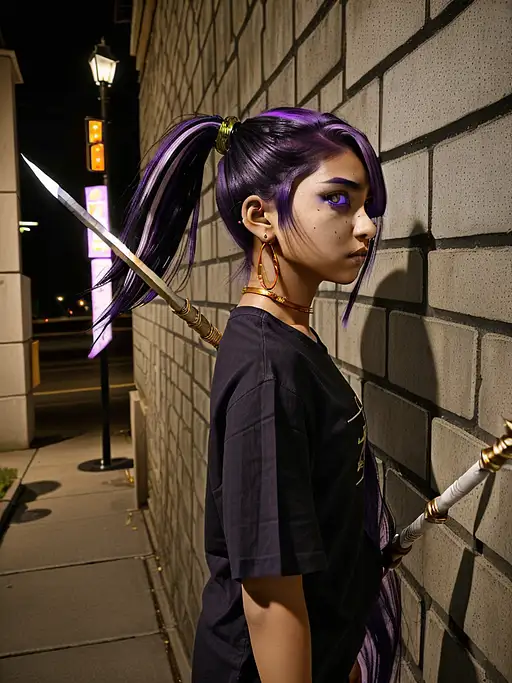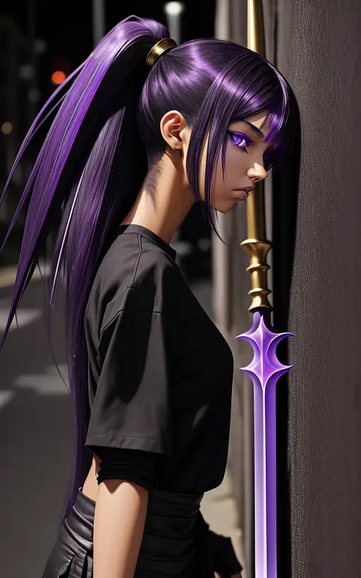 over 1 year ago side view emo beautiful tan skin girl. purple eye iris. black shirt. lnog purple hair black highlights in hair. stand at a side-walk. back against a wall. at night. holding a giant gold Ji spear. right handing Ji spear. manyolorian 0 47