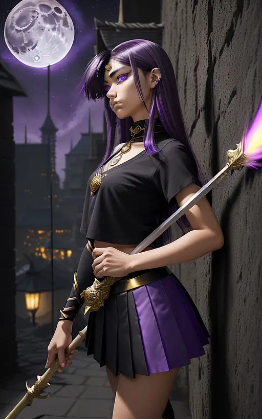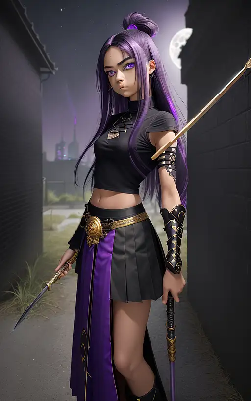 over 1 year ago above front view. emo beautiful tan skin girl. purple eye iris. black shirt and skirt. long skirt. lnog purple hair. black highlights in hair. stand at a side-walk. back against a wall. holding a giant gold magic Ji spear. spear on girl's back. at night. top of building moon in the night sye. 8k. manyolorian 0 65
