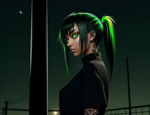 over 1 year ago side view emo beautiful tan skin girl. 18. green eye iris. black shirt. green highlights on black hair. back against a pole. looking at the knife in her hand. at night. big moon in the night sye. 8k. manyolorian 0 52