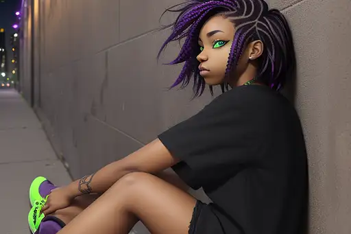 over 1 year ago side view. emo girl. beautiful african americans. gold eye iris. dark gray shirt. lnog purple hair. bright green highlights in hair. sitting in the street back against a wall. looking at the ground. at night. manyolorian 0 63