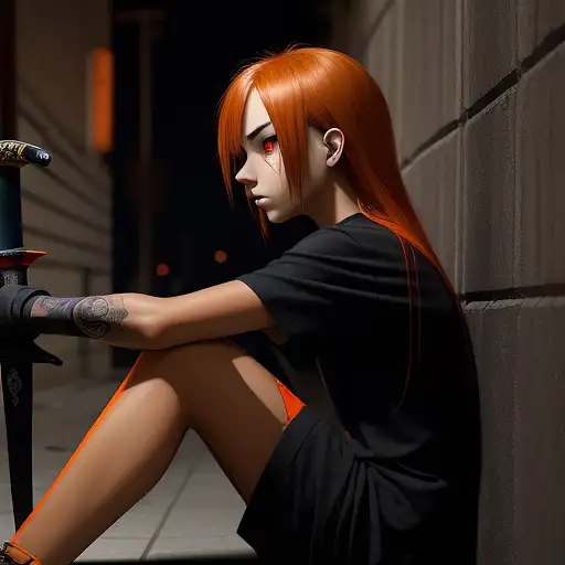 over 1 year ago side view emo beautiful tan skin girl. red eye iris. black shirt. orange highlights in hair. sitting in the street back against a wall. looking at the ground. at night. holding a sword in right hand. manyolorian 0 44