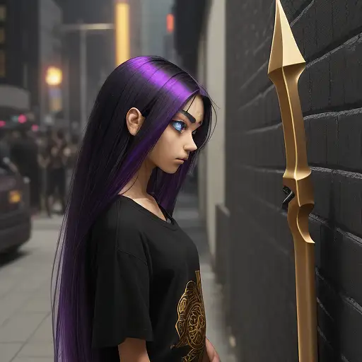 over 1 year ago side view emo beautiful tan skin girl. gold eye iris. black shirt. lnog purple hair black highlights in hair. stand at a side-walk back against a wall. looking at the ground. at night. holding a giant gold Ji spear. right handing Ji spear. manyolorian 0 46