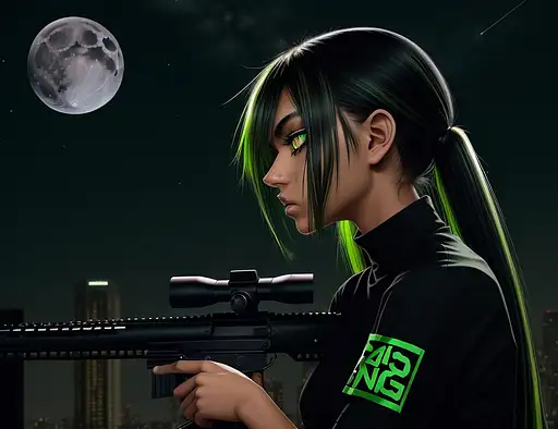over 1 year ago side view emo beautiful tan skin girl. 18. green eye iris. orange eye choroid. black shirt. green highlights on black hair. back against a pole. rifle Barrett M82 in right hand. at night. top of building moon in the night sye. 8k. manyolorian 0 51