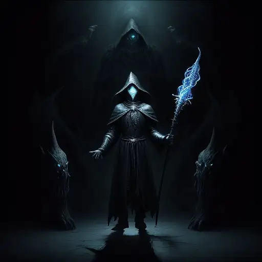 over 1 year ago wizard in a black room with a bright staff/sword Dark souls sorcerer woth monsters all arownd him. manyolorian 2 130