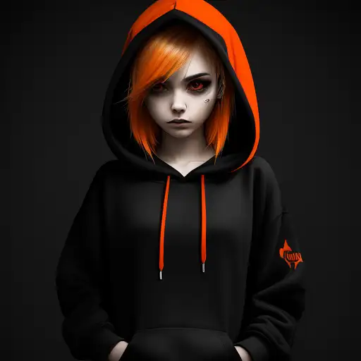 over 1 year ago emo girl in black hoodie with orange highlights in the hoodie. red eyes hands in hoodies pockets. manyolorian 0 43