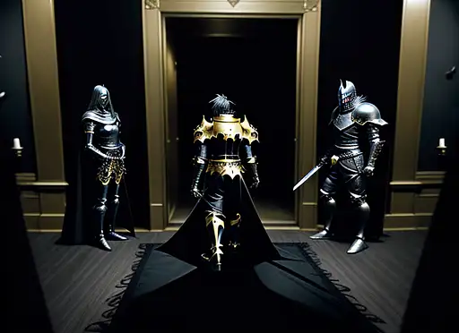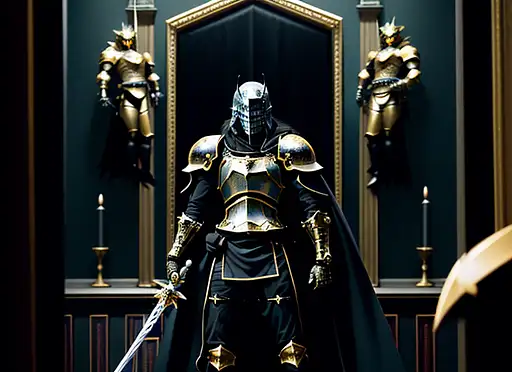 over 1 year ago spooky vibes anime black knight with gold sword at his side in a darck room. with monsters inside waching him. manyolorian 0 38