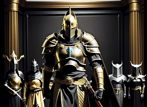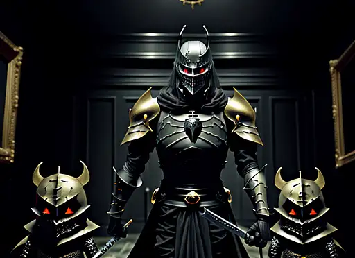 over 1 year ago spooky vibes anime black knight with gold sword at his side in a darck room. with monsters surrounding him. manyolorian 0 42