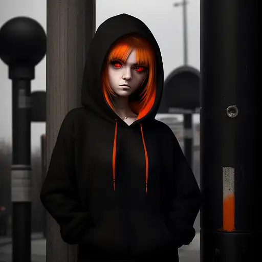over 1 year ago emo girl in black hoodie with orange highlights in the hoodie. red eyes looking down. hands in hoodies pockets. back against light pole. manyolorian 0 51