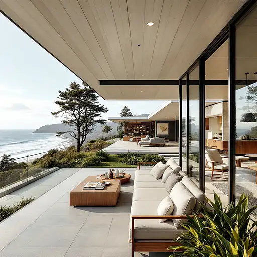 7 months ago Hyper realistic eye level exterior photo of a mid century modern style house overlooking the ocean, daylight, indirect lighting, AD magazine, Frank Lloyd, Eames, Mies van der Rohe miakittykaetty 0 33