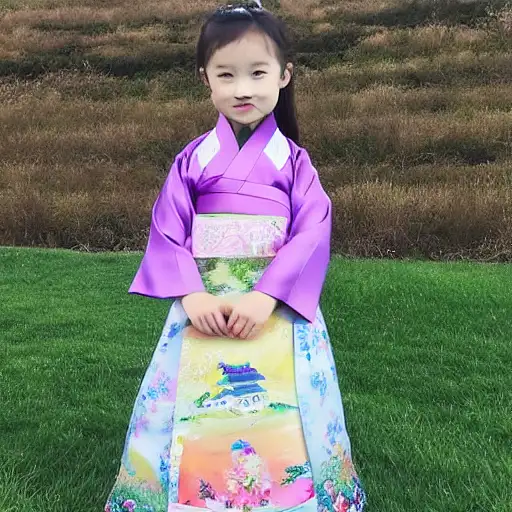 over 2 years ago A Hanbok with a landscape drawn by a 3-4 year old girl on the skirt can be a beautiful and unique piece of art. A Hanbok is a traditional Korean dress that is often worn for special occasions, such as weddings or festivals.If a 3-4 year old girl were to draw a landscape on the skirt of a Hanbok, she might include elements such as trees, flowers, and mountains. She might use bright colors to create a cheerful and lively scene, or she might opt for more muted tones to convey a sense of peace and tranquility.The landscape on the skirt of the Hanbok could be a reflection of the child's own experiences or imagination, or it could be inspired by real-world landscapes that she has seen in pictures or during outdoor activities. Regardless of the inspiration, the child's unique perspective and artistic style would shine through in the finished product, creating a one-of-a-kind piece of wearable art. mjlee 0 110