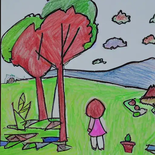 over 2 years ago A landscape drawn by a 3-4 year old girl can be a delightful and imaginative work of art. At this young age, children are just beginning to explore the world around them, and their artistic expressions often reflect their observations and experiences.In a landscape drawing, a 3-4 year old girl might include elements such as trees, clouds, mountains, or a body of water, and use bright and cheerful colors to create a lively scene. Alternatively, she might experiment with different textures and patterns to add depth and interest to her drawing.Regardless of the specific details, a landscape drawn by a 3-4 year old girl is likely to showcase her creativity, curiosity, and individuality as an artist. Encouraging her to explore different styles and techniques, and praising her efforts, can help foster a love of art and creativity that will stay with her for years to come. mjlee 0 63