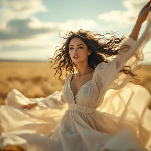 8 months ago <ссылка на изображение> A cinematic highly detailed shot of a young woman with slightly tanned skin voluminous curly hair and deep brown eyes She is wearing a flowing white dress that moves beautifully as she dances in the open steppe Her movements are graceful and free with her hair caught in the wind and the fabric of her dress lifting dynamically The warm golden light enhances the atmosphere creating a dreamy and artistic feel Photorealistic details intricate textures and a beautifully balanced composition --iw 2 --ar 16:9 --v 6 --q 2 --style 4b --seed 1398880791 mollie_0696 0 5