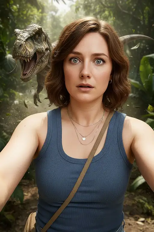 12 hours ago A hyper-credible sun-facing selfie (not a mirror shot; no phone visible) captured on an iPhone 16 Pro Max. Subject: the uploaded woman Hair: Makeup: subtle black eyeliner, matte lipstick; natural pores (no beauty filter). Expression (shocked): brows lifted and knit; eyes wide with bright catchlights; pupils slightly constricted by sun; mouth parted in a small inhale (not exaggerated); faint cheek/neck tension; micro-sheen on T-zone from heat. Wardrobe (tank top + accessories): matte ribbed cotton tank top in desaturated slate blue (no logos), scooped neckline, thick straps, relaxed fit; soft fabric micro-creases from movement, no plasticky shine. Accessories: tiny silver huggie hoops; two thin layered silver necklaces (one short box chain with a 2β3 mm disc pendant, one slightly longer cable chain); fabric-strap field watch (olive) on left wrist; woven paracord bracelet (neutral) on right wrist; a slim tan canvas cross-body strap from a small pouch just grazing the frame edge (bag itself mostly out of frame). Jewelry is low-gloss so it doesnβt flare; keep silhouettes clean and non-distracting. Moment: behind her, a realistic, predatory dinosaur (T. rex-like) leaping from foliageβlow, sneaky posture; mouth slightly open with saliva filaments; cat-like focused eye; fine scales and muscular anatomy; dust/leaf debris kicked up. Lighting & look: broad noon daylight in a lush jungle (large leaves, sun shafts). Sun is the key in front of her (10β11 oβclock) for crisp, short shadows and hair rim-sparkles; use natural ground/leaf bounce as fill (key:fill β 3:1) so shadows stay readable. Feather highlightsβno blown hotspots on cheeks/forehead. Dynamic range preserved (retain sky/leaf detail); no obvious filters. If supported, apply background-only micro-motion blur and handheld micro-shake while keeping her face tack-sharp. Framing & optics: vertical portrait selfie at arm-length, slight wide-angle feel; background compressed enough to keep the dinosaur readable. Shallow DoF from close focus on her faceβeyes ultra-sharp; controlled speculars along hair layers; distinct catchlights in eyes. Environment: humid air; faint pollen/dust motes; torn leaves mid-air; scuffed ground. Color: sunlit greens; warm, lifelike skin; dinosaur hues olive/umber/ashβnot plastic. Hard rules: do not show a phone; selfie (not mirror); no stylized filters; no heavy shadows; adult subject. Avoid: plastic toy textures, CGI gloss, grim darkness, lens flares across face, exaggerated depth warping, artificial makeup blur. 4a16649e3b7 1 4