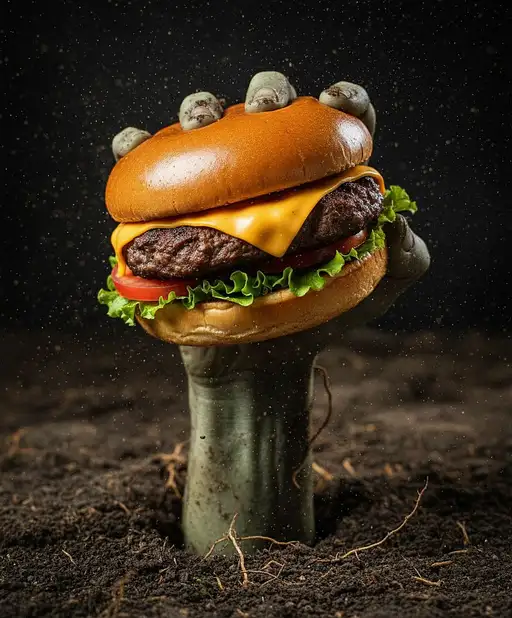 7 days ago "A zombie hand breaking through the earth holding a beef burger with melted cheese — extreme close-up, cinematic lighting from below, with soil and dust particles flying in slow motion.” Karolespi11 0 11