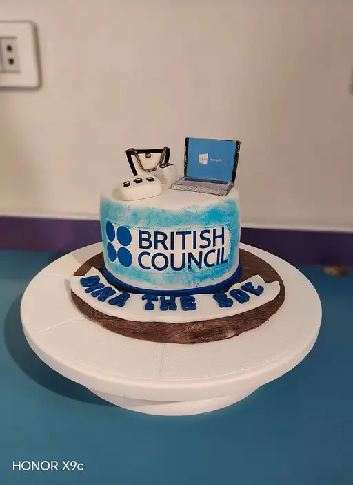 5 days ago High-quality food photo of a fondant cake with British Council logo, corrected colors, clean edges, no imperfections, background is softly blurred light cream, photographed with a professional DSLR camera, perfect lighting, elegant and polished." Nada 0 8