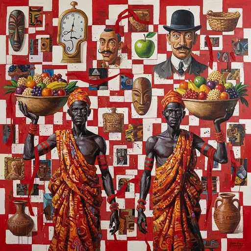 4 days ago A painting of two African men in traditional carrying food, with the background being an abstract collage made from red and white squares, including images representing historical figures such as Dali, Magritte, and African crafts, with red fabric woven into it and red stripes on their . The overall style is very colorful and expressive. It's a vibrant scene that captures attention. Rick17hi8 0 10