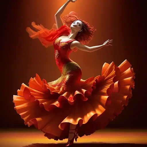 almost 2 years ago A fiery flamenco dancer, adorned in vibrant red and gold, twirls and stomps to the beat of the music, her ruffled dress billowing around her in a mesmerizing display of passion and grace., conceptual art, vibrant, cinematic, photo Nida_Rao 1 93