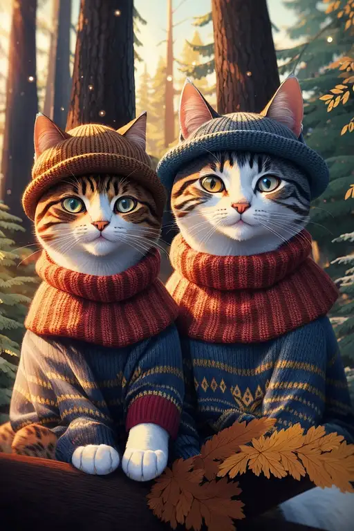 2 years ago two cats in hats and sweaters, forest background, cinematic, 3d animation, 4k oghakuuu 2 170