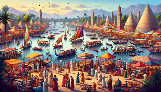 over 1 year ago Picture a lively festival along the banks of the Nile. Colorful boats sail by, their sails adorned with lotus blossoms. Musicians play reed flutes, and dancers sway to rhythmic drumbeats. Fragrant spices waft from food stalls, where vendors sell honey cakes, figs, and dates. Children chase each other, their laughter echoing across the water panadora 0 46