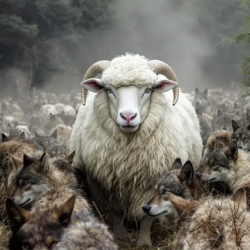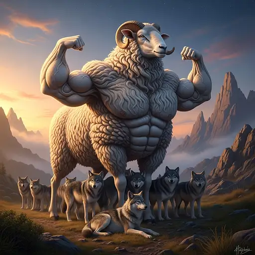 15 days ago a flock of wolves guarded by a very large and strong sheep, with wool wavy in the shape of muscles phacher 0 7