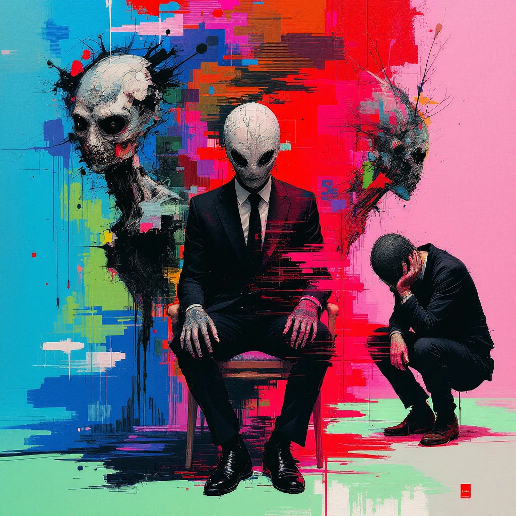 A surreal, abstract artwork featuring three figures. The central figure is seated in a dark suit, with an eerie, faceless head and shadowy features. The figure on the left is a distorted humanoid with intricate textures and layers blending with the background. The figure on the right is hunched, wearing dark clothing, with elements of chaos and fragmentation in their form. The background transitions between vibrant blue, red, green, and pink, with digital glitches and abstract strokes blending seamlessly. The overall style is expressive, emotional, and visually fragmented with heavy textures and bold colors.