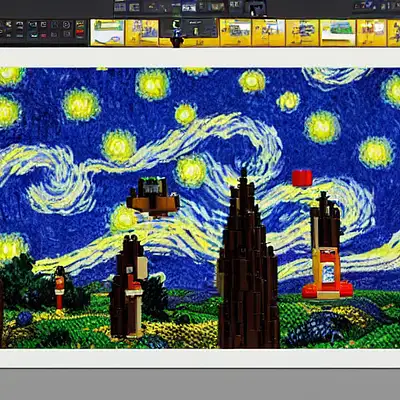 a wholesome Lego product photo, of a Lego scene of the painting Starry Night of Van Gogh, using lego blocks, real photo, product photo, medium shot, studio Ghibli, Pixar and Disney animation, sharp, Rendered in Unreal Engine 5, Lego key art by Greg Rutkowski, Bloom, dramatic lighting, J. C. Leyendecker