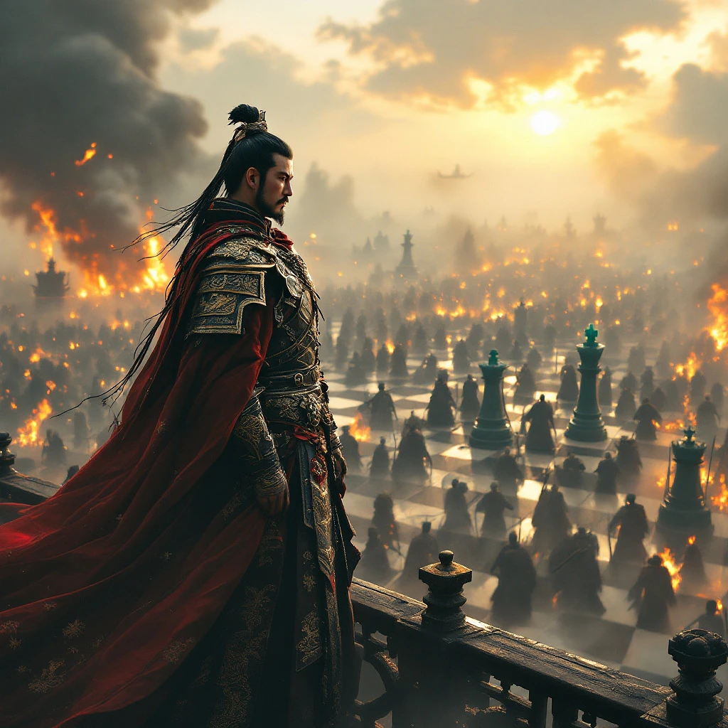 A legendary Chinese general Zhou Yu, inspired by Sun Tzu, stands on the deck of a burning warship during the Battle of Red Cliff. He wears intricate silver Tang-style armor adorned with golden dragon motifs, a flowing crimson cape fluttering in the wind. The battlefield beneath resembles a vast, surreal chessboard stretching infinitely into the misty horizon. Soldiers act as pawns, war elephants as rooks, archers as bishops. Zhou Yu stands beside a massive jade king chess piece, strategizing his next move as flames and smoke rise from enemy ships in the distance. Golden sunset filters through the fog, casting dramatic light and shadow, highlighting the general’s wisdom and heroic presence. Ultra-detailed textures, cinematic lighting, 4K realism, surreal symbolism, strategic depth, historical accuracy, epic composition. --ar 16:9 --v 6. 0 --style raw --s 750 --c 15