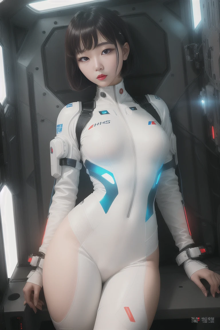 (1girl) , (full body) , (white futuristic sci-fi bodysuit) , Beautiful Korean woman, kpop idol, (Cute Loose Bob hairstyle) , symmetrical eyes, realistic, sharp focus, HD, highly detailed, intricate, photography, hyperrealism, hyperrealistic, film, studio portrait, detail, dramatic lighting, (red lips) , (small breasts)