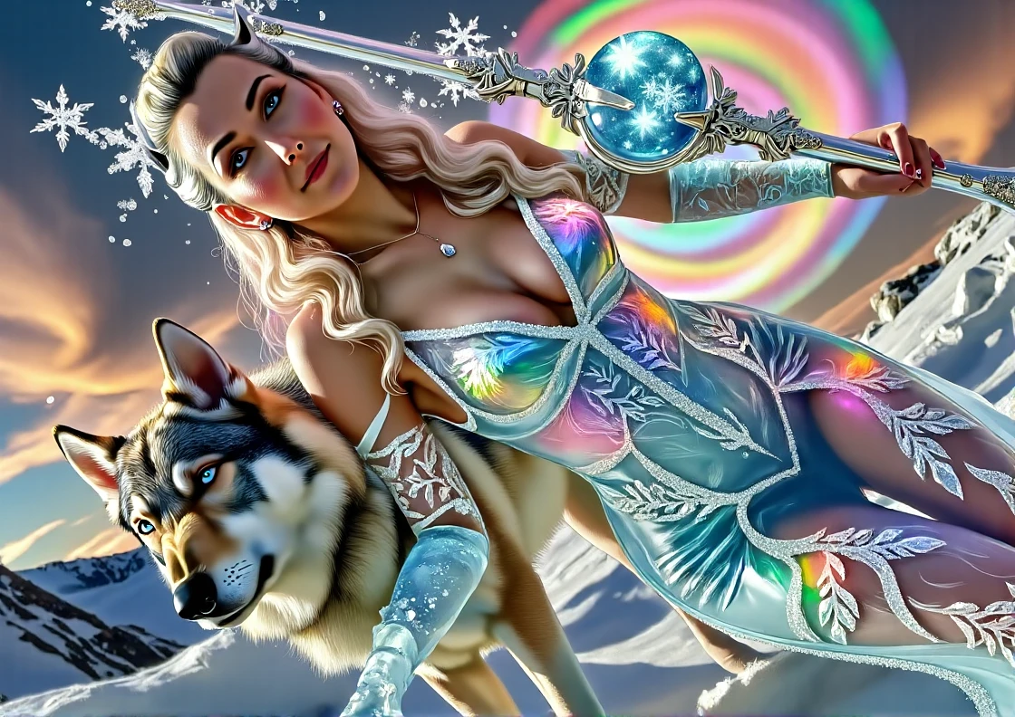 Realistic illustration of an ice maiden and her wolf companion