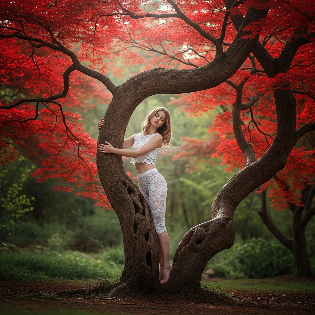 Professioneel gemaakte foto, een extreem mageren 19 jarige meisje met half-lang blond gekleed in wit lace korte legging en wit lace kort mini topje staat tegen een oude magische levensboom te knuffelen die zijn takken om haar heen slaat, lentebos met rode esdoorns een foto zo verfijnd dat het echt lijkt