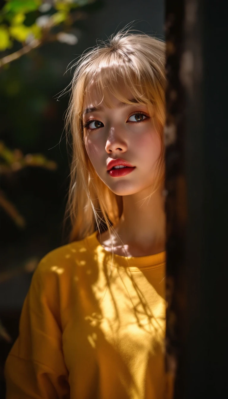 long blond Asian girl in a yellow shirt is posing, soft, atmospheric lighting --chaos 33 --profile yruxpc2 --stylize 750 --v 6. 1