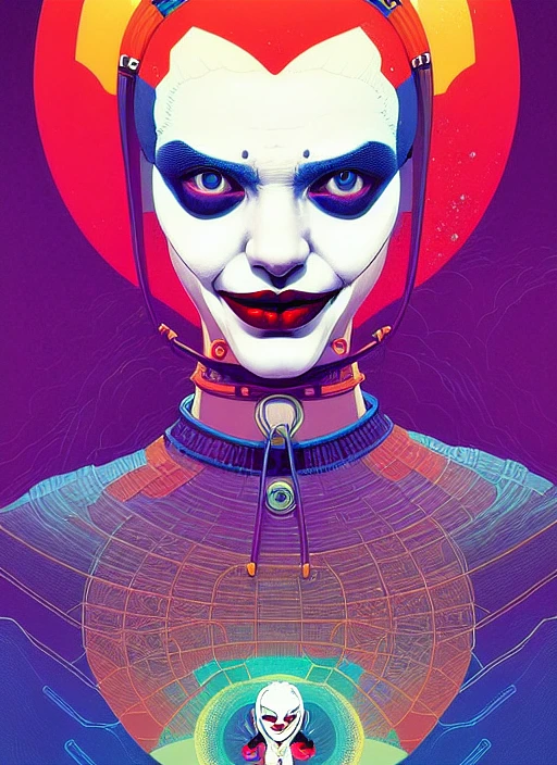 symmetry! ! stunning portrait of harley quinn! ! by victo ngai, kilian eng vibrant colors, dynamic lighting, digital art, winning award masterpiece, fantastically beautiful, illustration, aestheticly inspired by beksinski and dan mumford, trending on artstation, art by greg rutkowski, 8 k