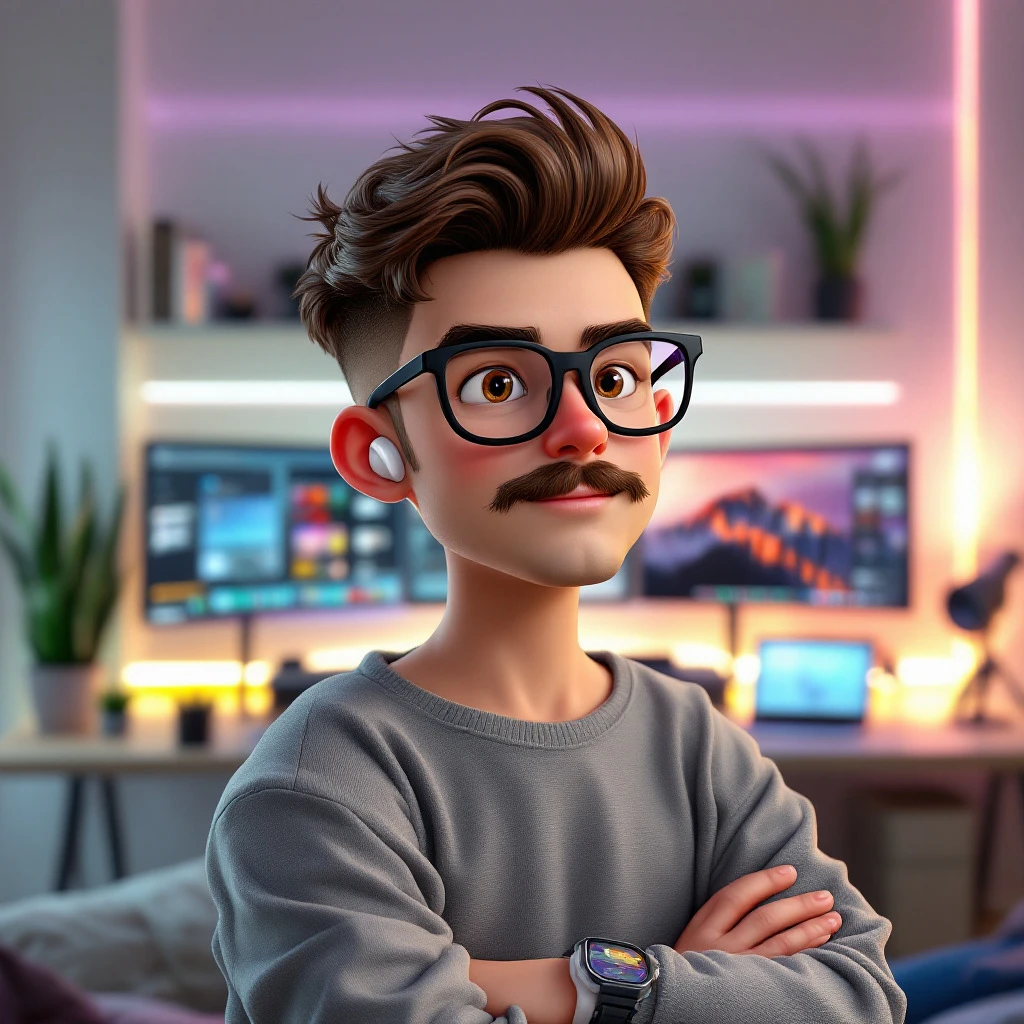 Create a semi-realistic male avatar with light skin, a large build, head (Buzz Cut hair) , a mustache, and hazel eyes. The avatar is wearing stylish glasses, AirPods Pro, and a modern watch. Outfit is simple and casual. The background is a modern and youthful bedroom featuring a clean desk setup with multiple screens, a laptop, and ambient LED lights.