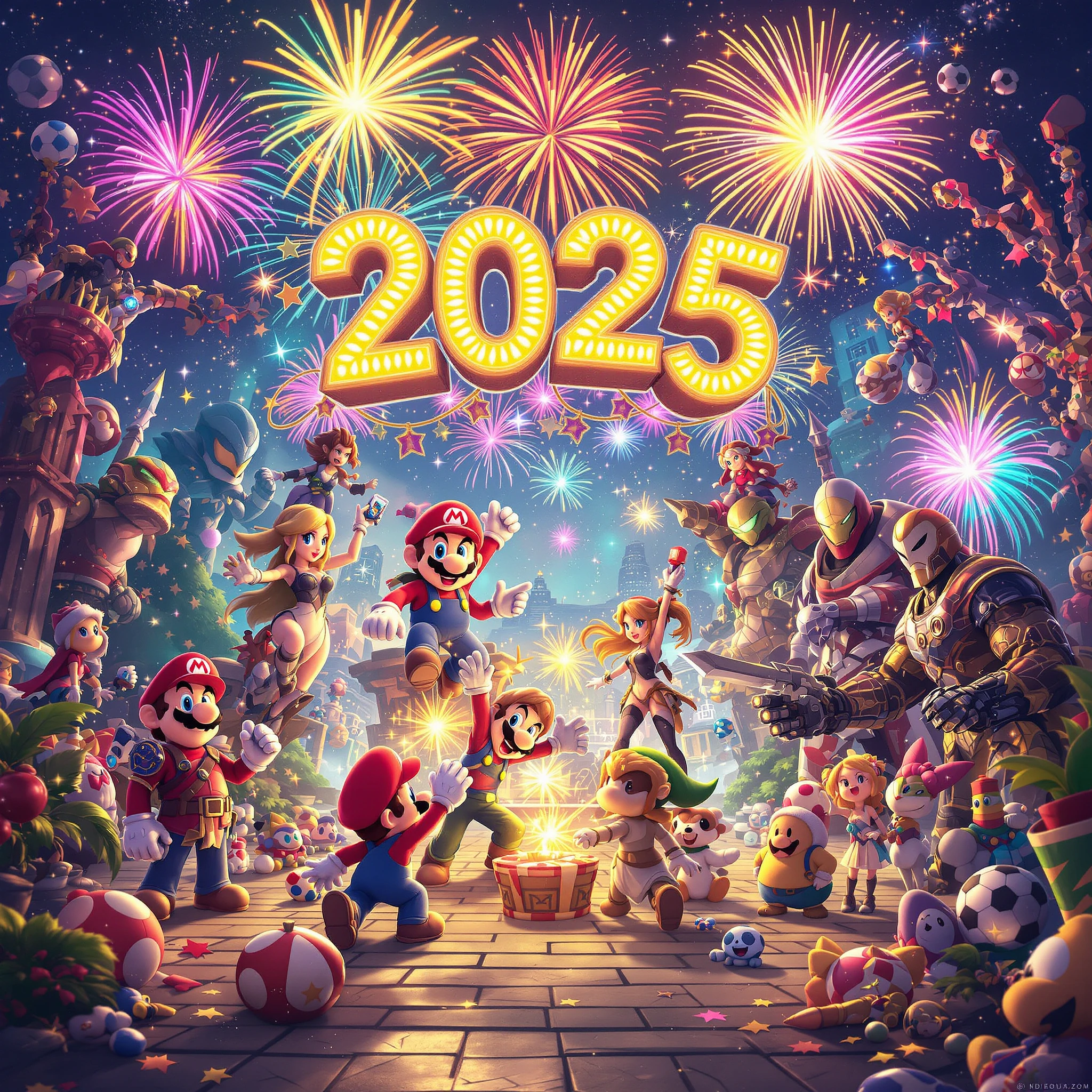 Create vibrant and celebratory New Year 2025 artwork featuring iconic video game characters from both Nintendo and PlayStation universes. Include well-known characters like Mario, Link, Samus, Kratos, and Aloy, engaging in a festive scene with colorful fireworks, glowing decorations, and dynamic lighting. The environment should evoke joy and excitement, blending futuristic and fantastical elements, in the highly detailed and stylized aesthetic of MidJourney V4. Ensure the composition is lively, colorful, and immersive.