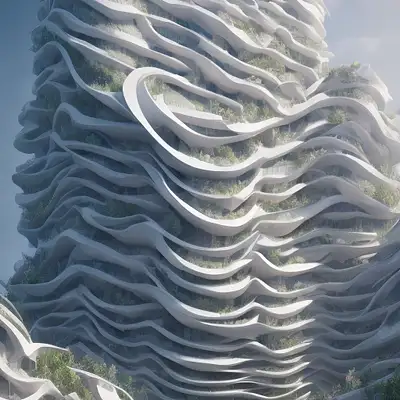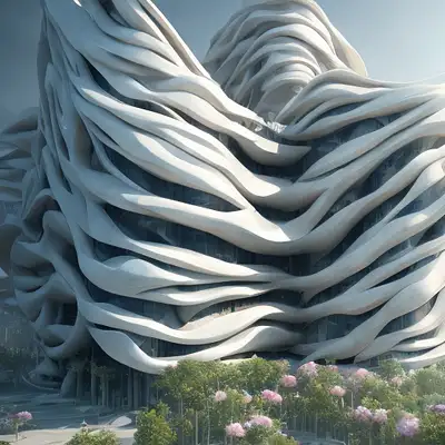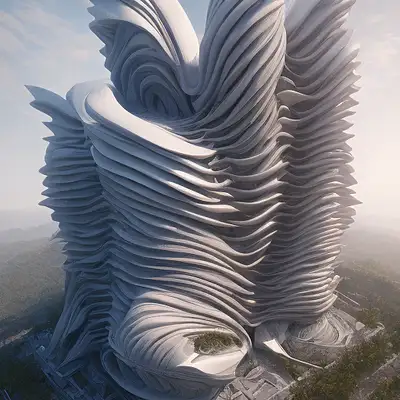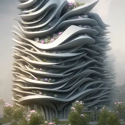 A exterior 3D rendering photorealistic visualization of a building inspired on the layers structure of the rose flower, Zaha Hadid style, unreal engine, raytracing, post-processing, zbrush, substance painter, trending on ArtStation, , Cinematic lighting, cinematic composition, rule of thirds , ultra-detailed, low contrast, natural lighting, fog realistic, light fogged, detailed, atmosphere, hyperrealistic , volumetric light, ultra photoreal, render in unreal engine 5, | 35mm | , Matte painting, movie concept art, hyper-detailed, insanely detailed, corona render, octane render, redshift render, 8k, --q 2