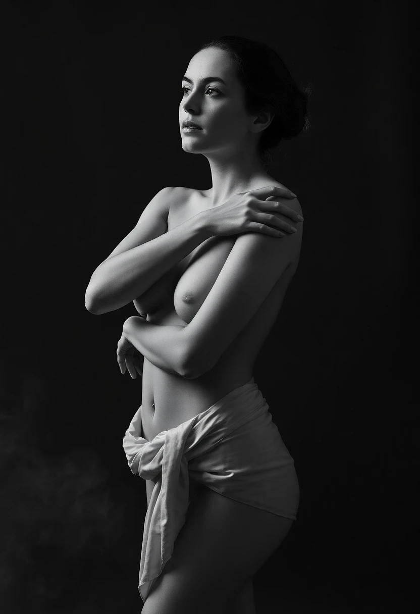 A monochromatic, fine art portrait of a nude woman standing against a dark, smoky background, with subtle textures and depth. The lighting is soft but directional, casting delicate shadows that contour her face and torso, emphasizing the graceful curvature of her body. She gazes thoughtfully into the distance, her eyes carrying a contemplative expression, as one arm reaches across to touch her opposite shoulder, creating a gentle, protective posture. The fabric wrapped around her waist has a soft, silken texture that catches light and shadow, adding depth and elegance to the composition. Hints of haze and smoke drift in the background, contributing to a sense of mystery and atmosphere, while the image maintains a balance of intimacy and strength. This ethereal portrait evokes themes of resilience, vulnerability, and timeless beauty