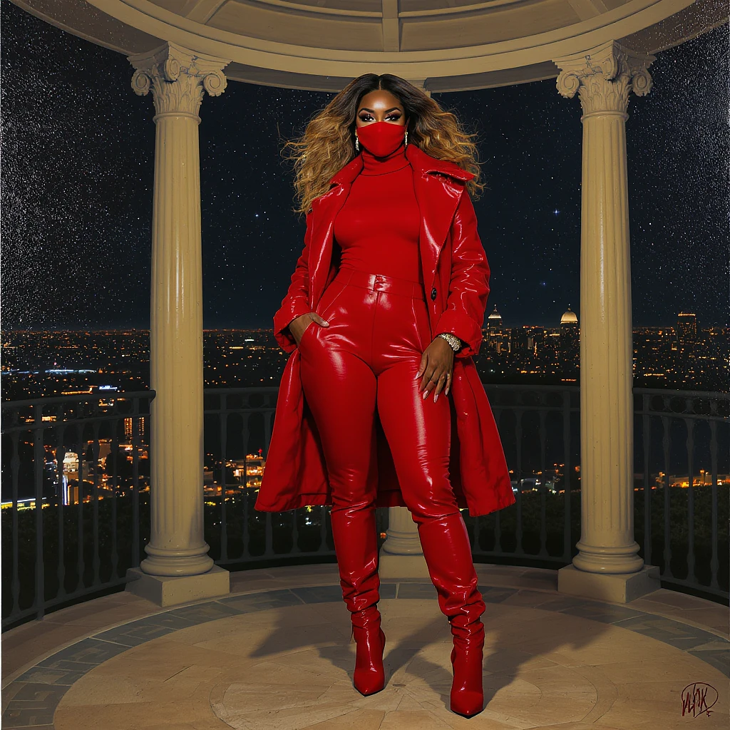 FULL BODY VIEW: 4K glossy oil painting of a regal large full-figure African American woman, standing under a gazebo, in full head-to-toe- body view, wearing a red turtleneck with a red mask covering the mouth and nose, red leather jumpsuit and matching leather jacket, with ombre wavy hair, detailed high heel boots, with a cityscape night background.