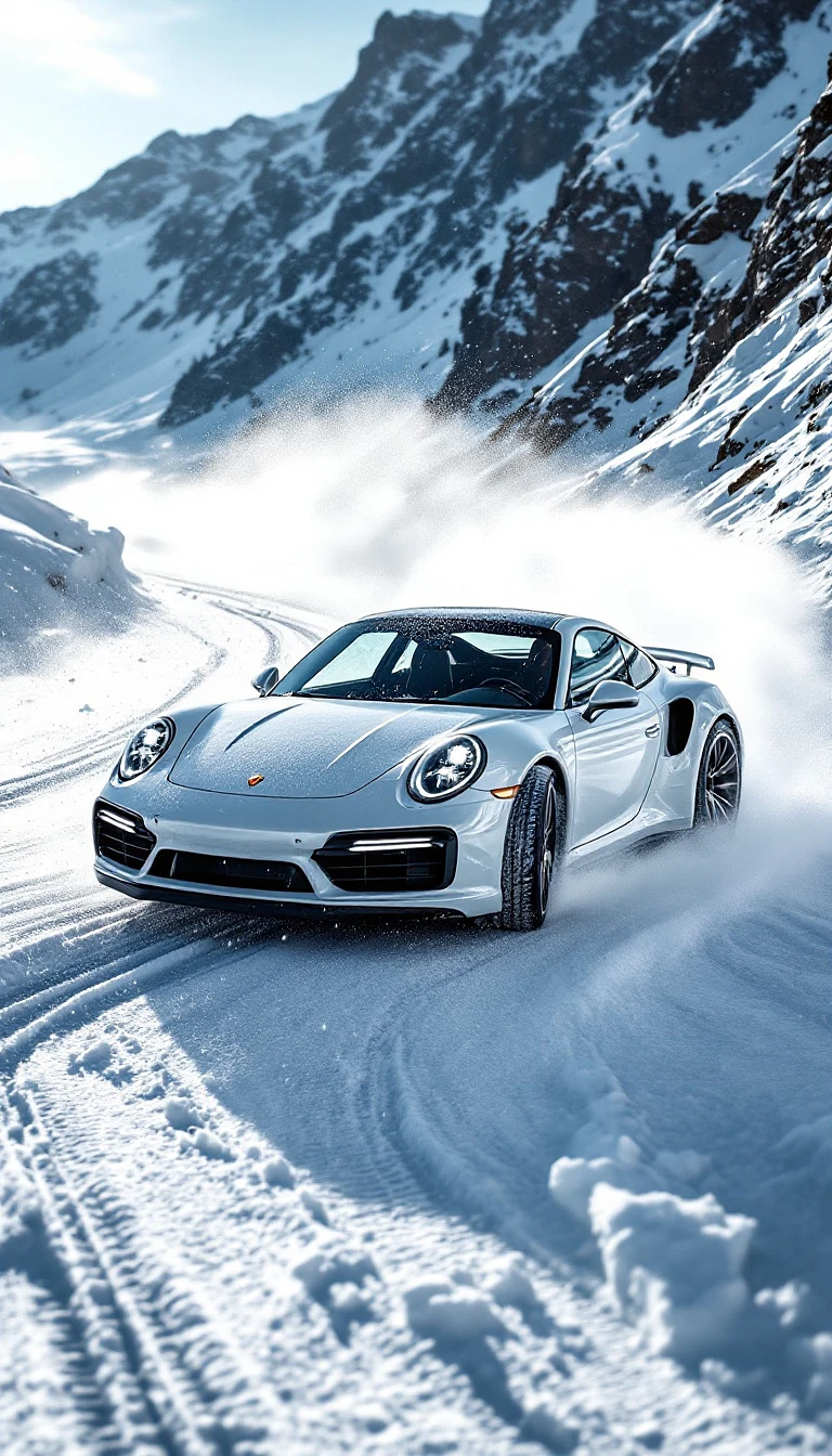 A sleek, arctic-white Porsche 911 Turbo carves through a snowy mountain pass, its tires biting into the icy road, spraying up a plume of powder, with a high-speed tracking shot highlighting its precision and power.