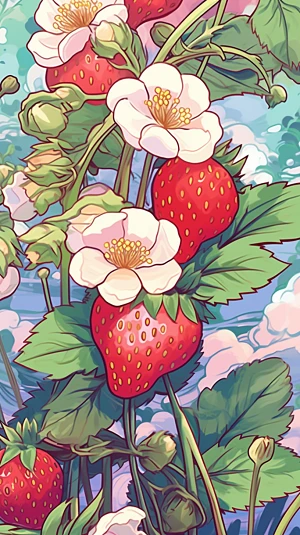 A dreamy illustration, anime delicate strawberries blooming and floating, garden-air, inspired by Art Spiegelman, with a pastel color scheme, ethereal, floral punk, soft and romantic pink scene background. --v 5. 1 --ar 9:16 --style raw --q 2