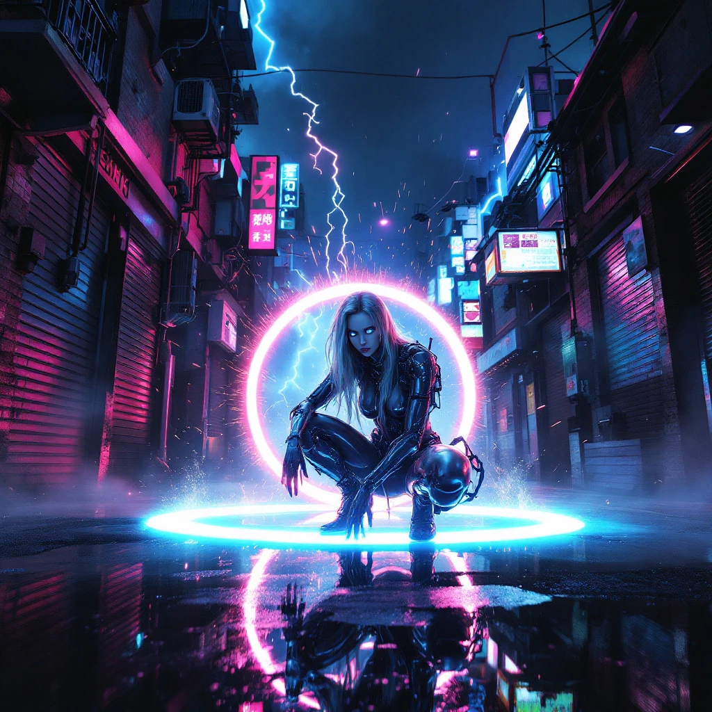 A hyperrealistic 8K cinematic masterpiece blending the gritty, neon-soaked aesthetic of a cyberpunk 1980s Tokyo alleyway with the intense action of a high-tech, futuristic battle. The scene unfolds in a dark, chaotic urban sprawl, alive with swirling fog and flickering neon lights that cast erratic, vivid glows of pink, blue, and fiery amber onto weathered brick walls and reflective puddles on the wet pavement. In the foreground, a stunning female android combatant crouches within a glowing circle of light, her sleek metallic body rendered with intricate, photorealistic detail. Her long, flowing hair moves as if caught in a gentle breeze, illuminated by particles of light and fiery sparks from a massive electrical discharge behind her. Her piercing blue glowing eyes lock onto the viewer with an aura of unrelenting power and readiness, embodying the fusion of elegance and lethal precision. Beside her, an iconic DeLorean, a symbol of retro-futuristic design, stands amidst the chaos, under siege by two hovering attack helicopters armed with M134 Miniguns. Streams of tracer ammunition pierce through the thick, swirling smoke, creating arcs of fiery destruction that illuminate the urban battlefield. The DeLorean's brushed silver metallic body gleams with reflected light from the surrounding neon signs, skyscraper silhouettes, and burning wreckage. Its taillights—one a fiery red and the other an amber hue—cut sharply through the haze, their reflections rippling across the puddles below. The surrounding environment is a tapestry of destruction and decay. Burning cars smolder in the distance, shattered glass and twisted metal scatter across the ground, while torn flyers cling to graffiti-covered walls. Overflowing dumpsters and rusted trash cans add to the dystopian atmosphere, complemented by the distant hum of sirens, the roar of helicopter engines, and the intermittent crackle of neon signs. A cracked neon sign reading "HEATWAVE" flickers erratically, illuminating the scene in pulses of vibrant energy. Volumetric lighting streams through the dense smoke, casting soft, diffused beams across the android’s gleaming body and the DeLorean’s muscular contours. Subtle reflections of nearby city lights ripple across the car’s angular lines, emphasizing its aggressive stance. The background cityscape looms, softened by the haze, with towering high-rises and distant neon signs peeking through the fog. The atmosphere is electric, alive with tension and visual intensity, as if pulled straight from an epic 1980s action-drama infused with high-tech cyberpunk fantasy. Every detail—from the fine grit on the street to the intricate mechanics of the android and the DeLorean’s polished wheels—contributes to the breathtaking realism of the scene. The dynamic composition, vibrant neon hues, and dramatic interplay of light and shadow create an unforgettable, immersive cinematic experience, perfect for showcasing on ArtStation or as a defining piece in the world of digital art.