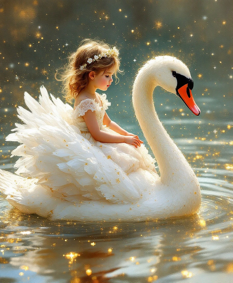 A doll like little baby girl riding a pretty swan very realisticly painted rendered in pearlescent white and sparkly shimmering gold cute backdrop Gustav klimt style