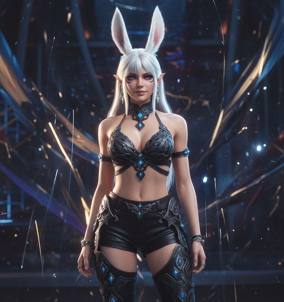 analog film photo This is a highly detailed and suggestive depiction of a Final Fantasy Viera woman, capturing her otherworldly beauty and mysterious allure within a chaotic yet enigmatic setting. The composition emphasizes her statuesque form and dynamic posture, hinting at a sexual position that commands attention. The use of soft, glowing lights highlights her luminous features, while the abstract, shadowy surroundings add depth and tension to the scene.